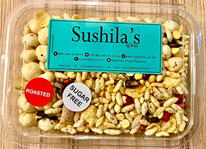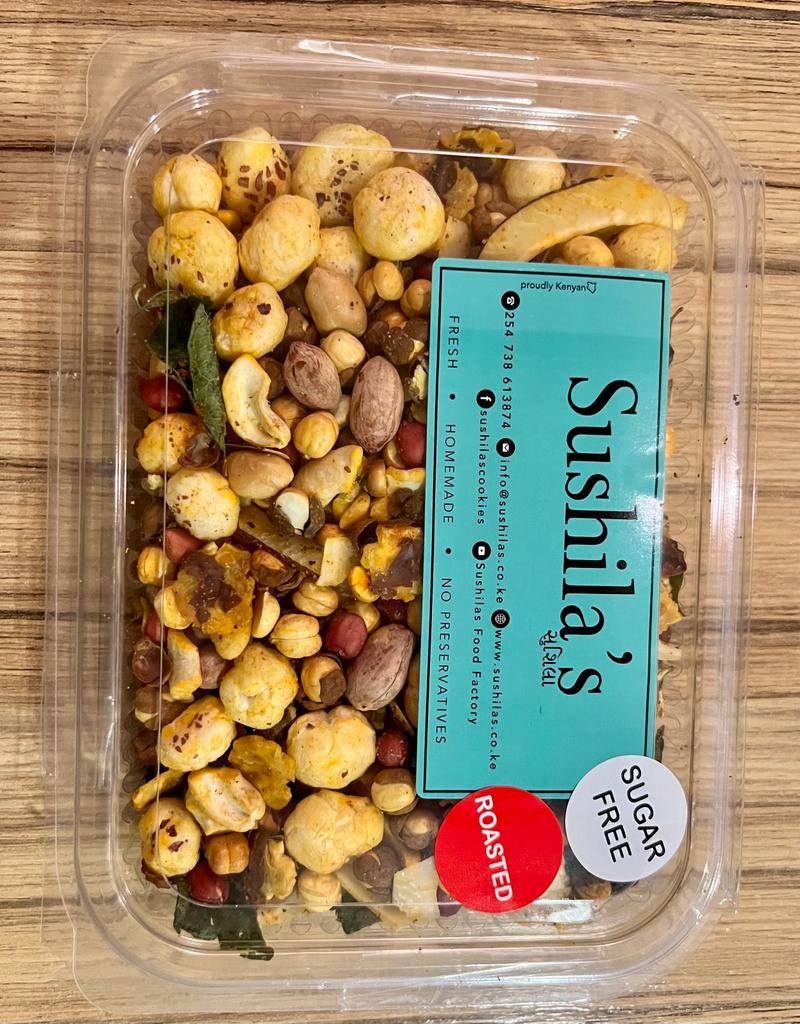 Ingredients: Roasted gram, makhana, cashewnuts, peanuts, dry coconut, home made flat black chickpeas, red chilli powder, salt, curry leaves, dry coriander leaves